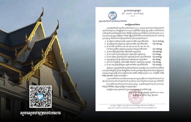 ភ្នំពេញ ៖ ក្រសួងរៀបចំដែនដី នគរូបនីយកម្ម និងសំណង់ សូមអញ្ជើញបងប្អូនអតិថិជនរបស់គម្រោងអភិវឌ្ឍន៍បុរី ផ្ទះល្វែង និងដីឡូត៍ទាំង៩ (ដូចមានក្នុងបញ្ជីឈ្មោះនៃតារាងឧបសម្ព័ន្ធជូនភ្ជាប់) មកទទួលយកបណ្ណកម្មសិទ្ធិ ចាប់ថ្ងៃទី២-៦ ខែមីនា ឆ្នាំ២០២៦ នៅរៀងរាល់ម៉ោងធ្វើការ។