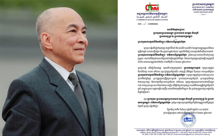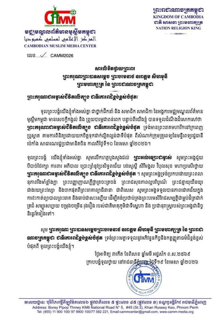 អង្គការមជ្ឈមណ្ឌលព័ត៌មានមូស្លីមកម្ពុជា ក្រាបបង្គំទូលថ្វាយ សារលិខិតថ្វាយព្រះពរ ព្រះករុណាព្រះបាទសម្តេច ព្រះបរមនាថ នរោត្តម សីហមុនី ព្រះមហាក្សត្រ នៃព្រះរាជាណាចក្រកម្ពុជា ក្នុងឱកាសដែលព្រះអង្គស្តេចយាងទទួលការវះកាត់ព្យាបាលព្រះរោគ នៅរដ្ឋធានីប៉េកាំង សាធារណរដ្ឋប្រជាមានិតចិន