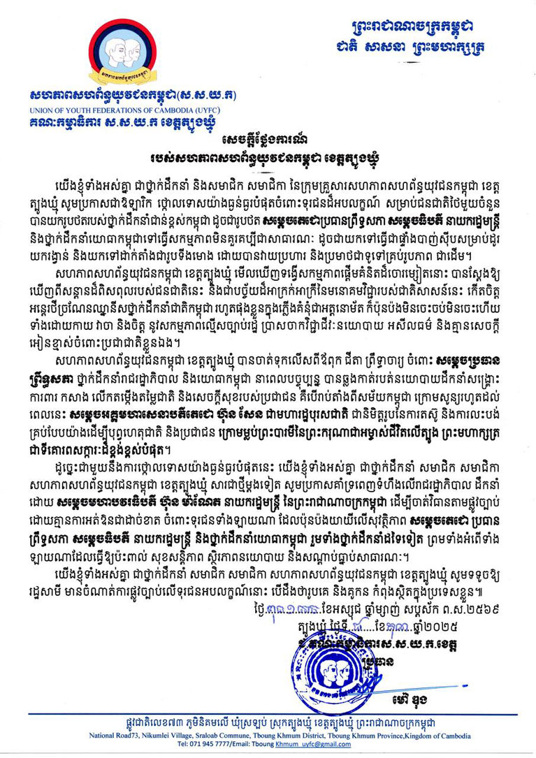 ត្បូងឃ្មុំ ៖ នាថ្ងៃទី ០៨ ខែតុលា ឆ្នាំ ២០២៥ សហភាពសហព័ន្ធយុវជនកម្ពុជា ខេត្ត ត្បូងឃ្មុំ ចេញសេចក្តីថ្លែងការណ៍ថ្កោលទោសយ៉ាងធ្ងន់ធ្ងរបំផុតចំពោះ ជនជាតិថៃ ទុរជនដ៏អបលក្ខណ៍ មួយចំនួន ដែលបាន យករូបថតរបស់ថ្នាក់ដឹកនាំជាន់ខ្ពស់កម្ពុជា ដូចជារូបថត សម្តេចតេជោប្រធានព្រឹទ្ធសភា សម្តេចធិបតី នាយករដ្ឋមន្ត្រី និងថ្នាក់ដឹកនាំយោធាកម្ពុជា ទៅធ្វើសកម្មភាពមិនគួរគប្បីជាសាធារណៈ ។