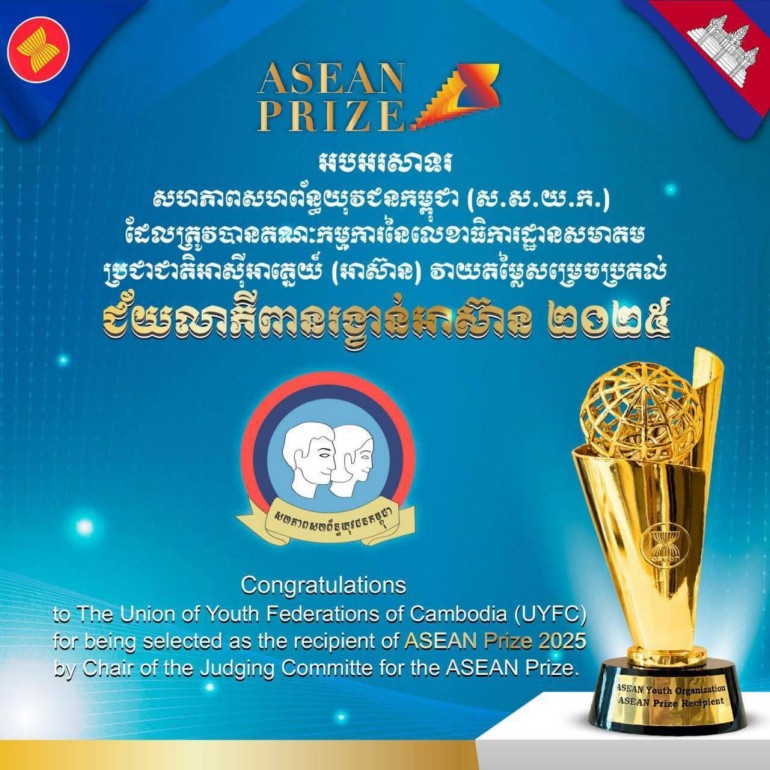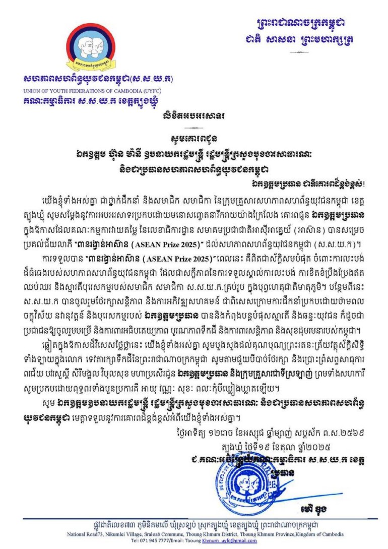 ឯកឧត្តម ម៉ៅ ឌុង ប្រធានសហភាពសហព័ន្ធយុវជនកម្ពុជា ខេត្តត្បូងឃ្មុំ និងសមាជិក សមាជិកា សហភាពសហព័ន្ធយុវជនកម្ពុជា ខេត្តត្បូងឃ្មុំ អបអរសាទរ ជូនចំពោះឯកឧត្តម ហ៊ុន ម៉ានី ឧបនាយករដ្ឋមន្ដ្រី រដ្ឋមន្ដ្រីក្រសួងមុខងារសាធារណៈ និងជាប្រធានសហភាពសហព័ន្ធយុវជនកម្ពុជា ក្នុងឱកាសដែលសហភាពសហព័ន្ធយុវជនកម្ពុជា(ស.ស.យ.ក.) ទទួលបានពានរង្វាន់អាស៊ាន-ASEAN Prize ពីលេខាធិការដ្ឋានសមាគមប្រជាជាតិអាស៊ី អាគ្នេយ៍ ដែលបង្ហាញពីសក្ខីកម្មនៃការទទួលស្គាល់នូវគុណតម្លៃរបស់សហភាពសហព័ន្ធយុវជនកម្ពុជា ដែលបានរួមចំណែកយ៉ាងសកម្មក្នុងបុព្វហេតុជាតិមាតុភូមិ។ ????????????????